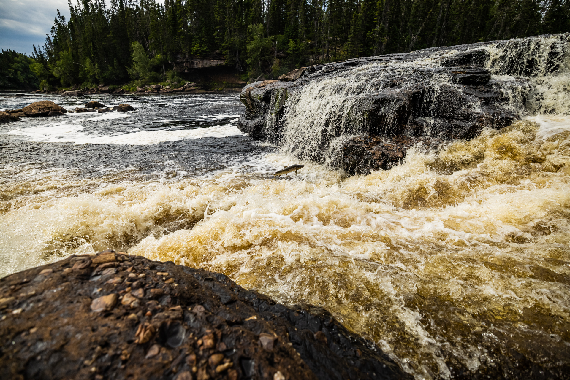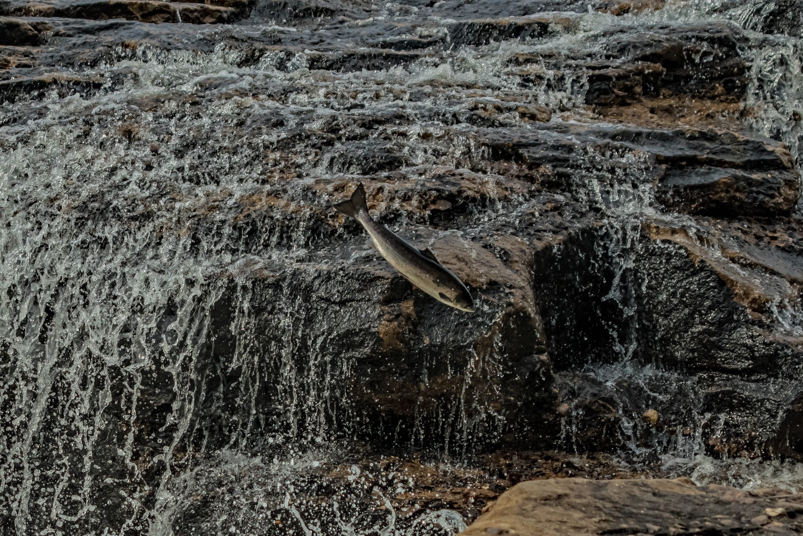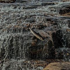 The Atlantic salmon is an anadromous fish meaning the adults live in the sea but return to freshwater to spawn, migrating into Newfoundland and Labrador rivers between early May and September. These fish are well known for their ability and determination and some have been known to leap as high as four metres to jump falls and other obstacles in their upstream journey to their birthplace. These jumps can be best viewed between late June and mid-August at Big Falls, where a salmon channel has been blasted into the rock to give these fine fish a helping hand.
