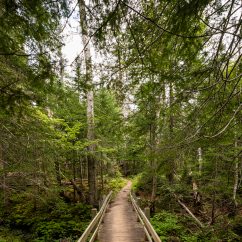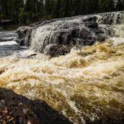 To the right of the parking lot is the Big Falls Trail which leads 100 metres down to the falls. Here you can see the impressive three metre high and 87 metre wide waterfall close up. From late June to mid-August, you can spot salmon leaping the falls as they try to make their way upstream to spawn.